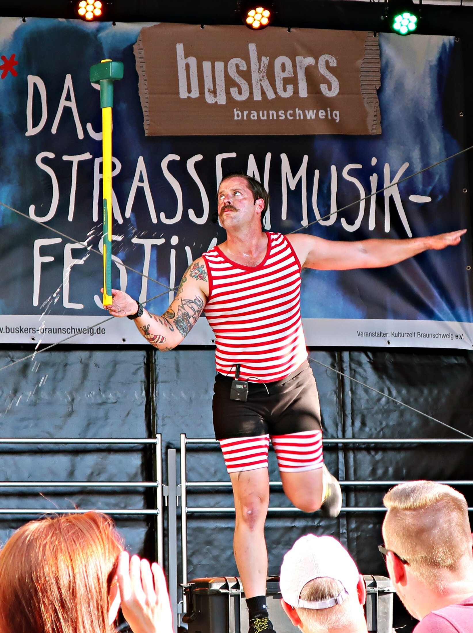 Mighty Mike jongliert mit einem Schlaghammer und drei Messer in der Hand.