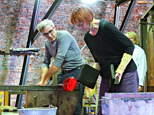 Glas muss immer wieder geblasen, heiß gemacht, geformt und schließlich abgeschnitten werden.