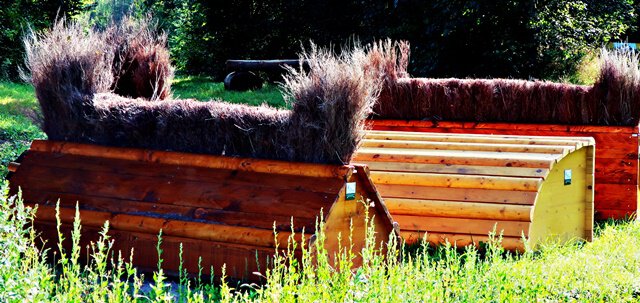 Gleich am Parkplatz Oderwald stehen sie, die Särge mit Haaren. Es sind wohl Hindernisse für Springpferde.