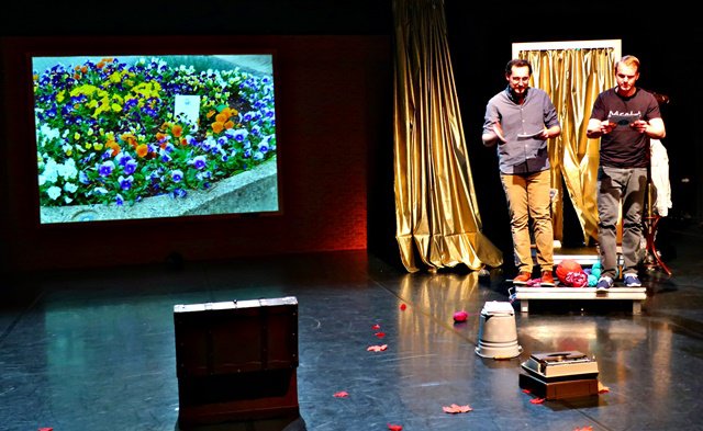 Die beiden Protagonisten verteilen ihre Botschaften auch in Blumenbeeten.