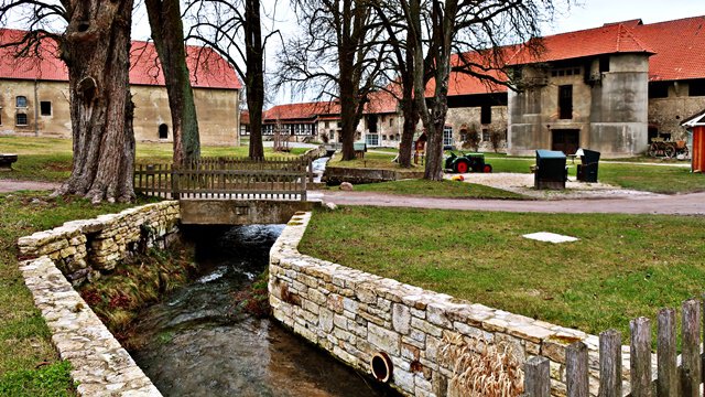 Bereits auf dem Gelände des Ritterguts stoßen wir auf die Wabe, die uns ein ganzes Stück unseres Weges begleiten wird.