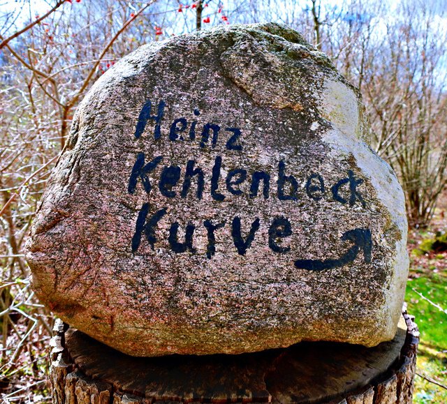 Gleich neben Tante Gretes Bank steht dieser Stein mit der Heinz Kehlenbeck Kurve, was immer damit gemeint ist.