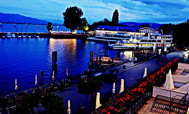 Ein Foto aus dem Hotelfenster: Der Lindauer Hafen in Abendstimmung.