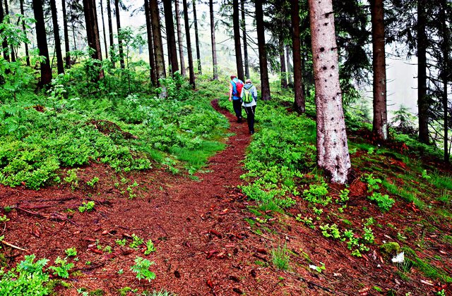 Wir verlassen die Schutzhütte wieder und gehen zurück auf den breiten und langweiligen Forstwanderweg.