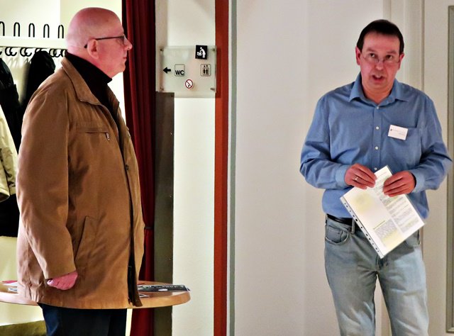 Die Eröffnungsrede hält Heiko Krause, Heimatpfleger in der Weststadt. Neben ihm steht Lutz Schrader, letzter Besitzer der ehemaligen Dreherei.