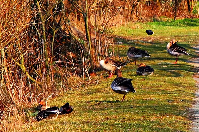 Kontrastprogramm am Südsee in Braunschweig: Gänse und Enten bereiten sich auf die Brutzeit vor.