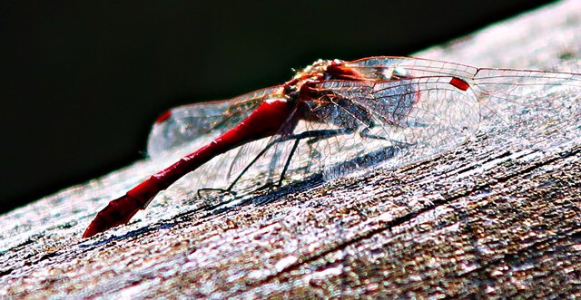Als wir den Aussichtsturm gerade verlassen wollen, lässt sich diese wunderschöne blutrote Heidelibelle auf ein Fotoshooting ein.