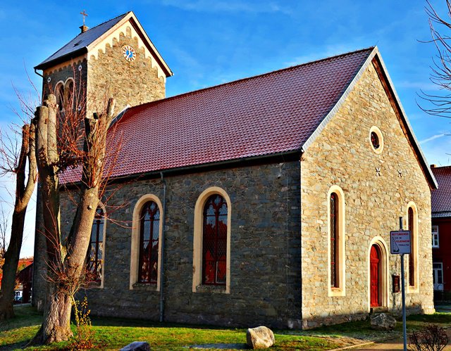 Vorbei an der Kirche von Allrode wandern wir in Richtung Albrechtshaus.