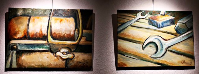 Die Bilder zeigen Detailaufnahmen von Schrauben, Hämmern und anderen Metallteilen, die in der Fabrik zum Einsatz kamen.