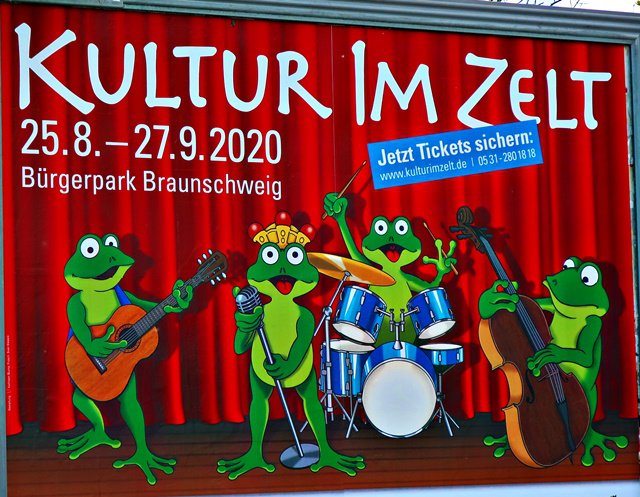 Hier steht sie noch die Werbung für Kultur im Zelt. Das wird wohl in diesem Jahr nichts werden.