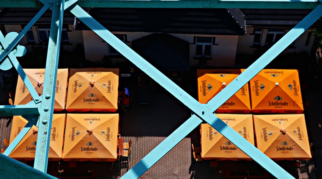 Blick vom Josephskreuz auf die Sonnenschirme des Cafés am Kreuz.