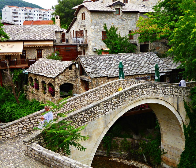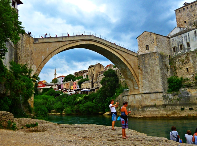 Das ist sie, die berühmt alte Brücke von Mostar. Erbaut wurde die Brücke von 1557 – 1566 als Ersatz für eine mittelalterliche Holzhängebrücke gebaut. Traurige Berühmtheit hat sie während des Bosnien-Krieges erlangt, als sie beschossen wurde und schließlich kaputt ging.