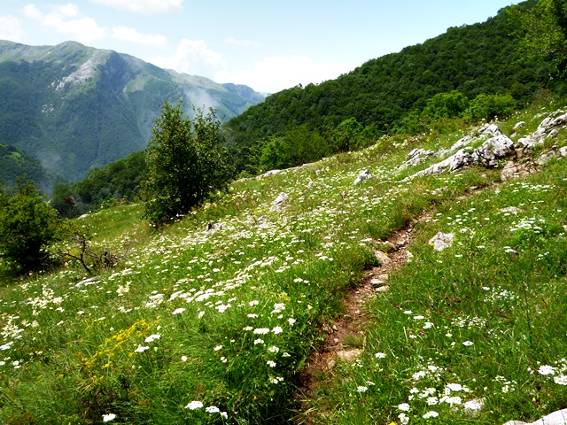 Wir starten unsere Wanderung in den Olympischen Bergen an diesem muslimischen Friedhof und gehen zunächst Richtung Gradina. Ziel ist das Dorf Lukomir, eines der wenigen Dörfer, die während des Krieges nicht zerstört worden.