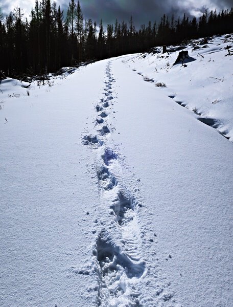 Das liebe ich: Neuschnee, weitestgehend unberührt. Nur eine Fußspur in der Mitte.