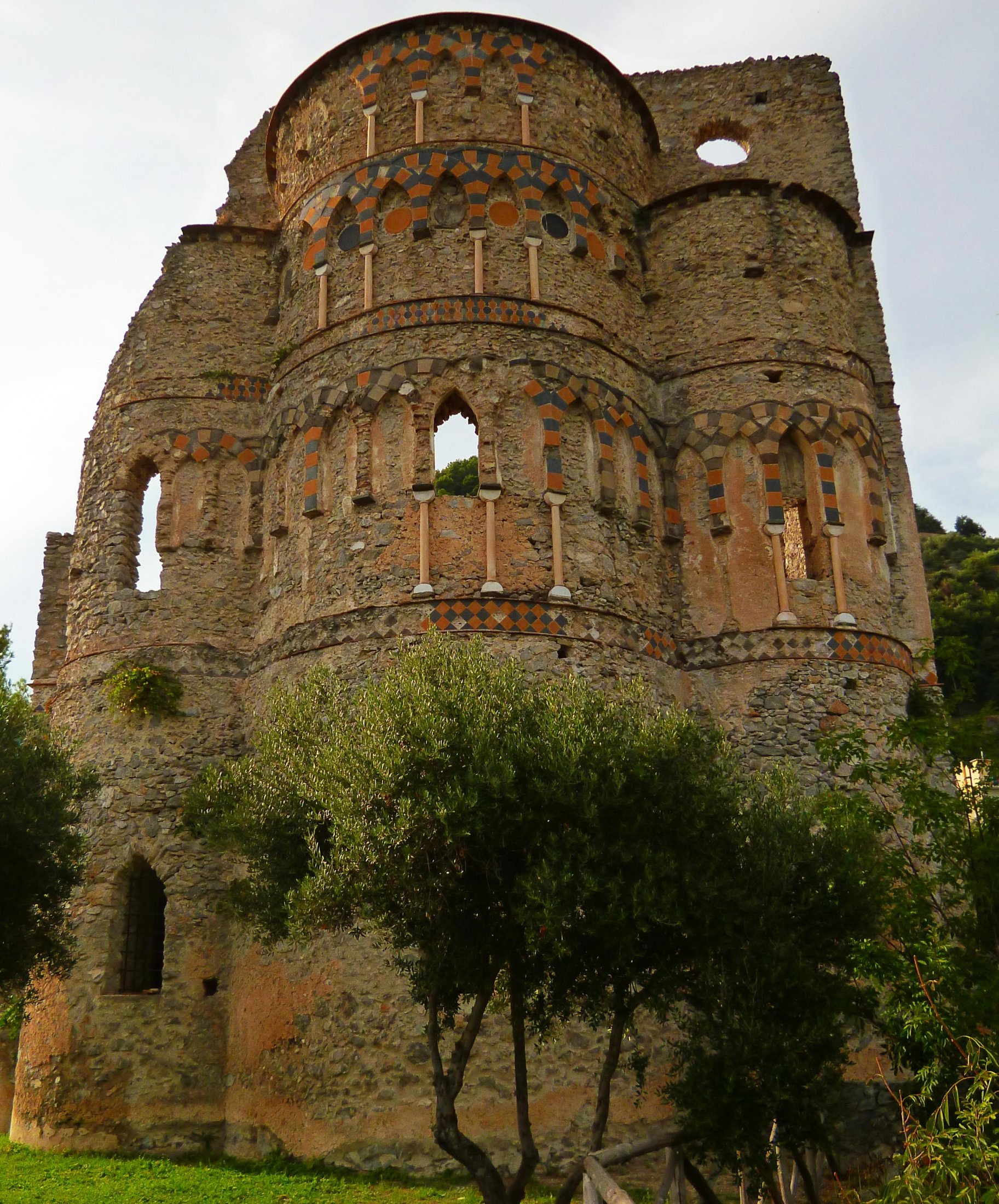 Die Ruinen der Basilica de St. Eustachio stehen hoch über dem Tal von Amalfi und Atrani.