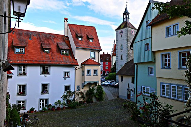 Blick in die Altstadt von Lindau. Hier steht auch der Narrenbrunnen.