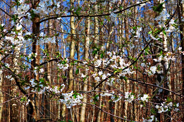 Zwischen den Fichten und Lärchen des Waldes blüht immer mal wieder ein Baum, das sieht wunderschön aus.