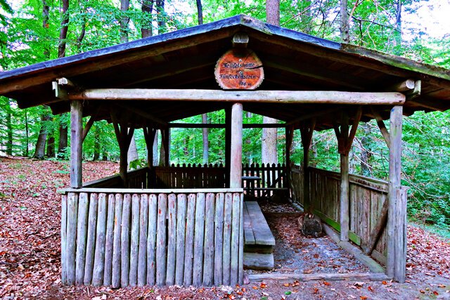 Die auf 176m hoch gelegene Teufelshütte. Diese Hütte lädt zum Verweilen ein. Direkt am Fünfeckenstein gelegen erreicht man sie aus allen Richtungen, wobei es aus Walbeck kommend der kürzeste Weg ist. Das Fünfeckenstein ist eine Kreuzung, an der fünf Wege zusammenlaufen und fünf große Steine liegen daher der Name.
