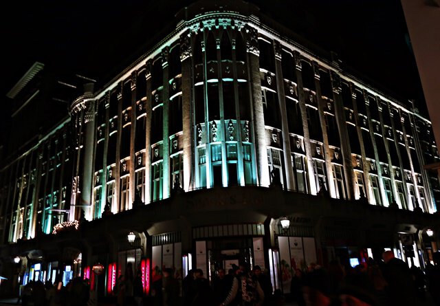 Nicht nur der Weihnachtsmarkt ist hell erleuchtet, auch viele Kaufhäuser strahlen in bunten Lichtern.