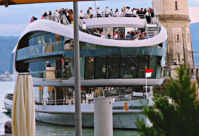 Abends beobachten wir von unserem Abendbrottisch dieses Partyboot mit Musikkapelle.