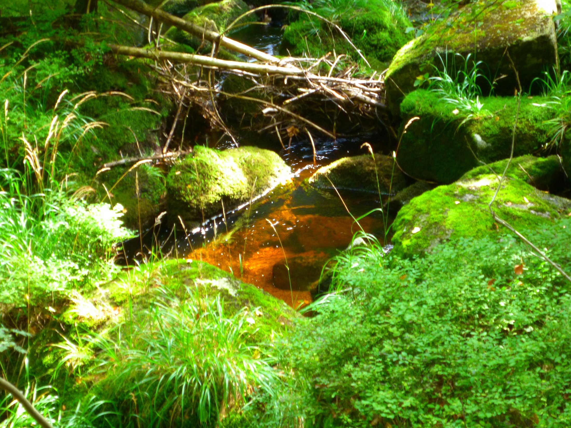 Moos und kupferfarbenes Wasser in der Nähe des Eckerstausees.