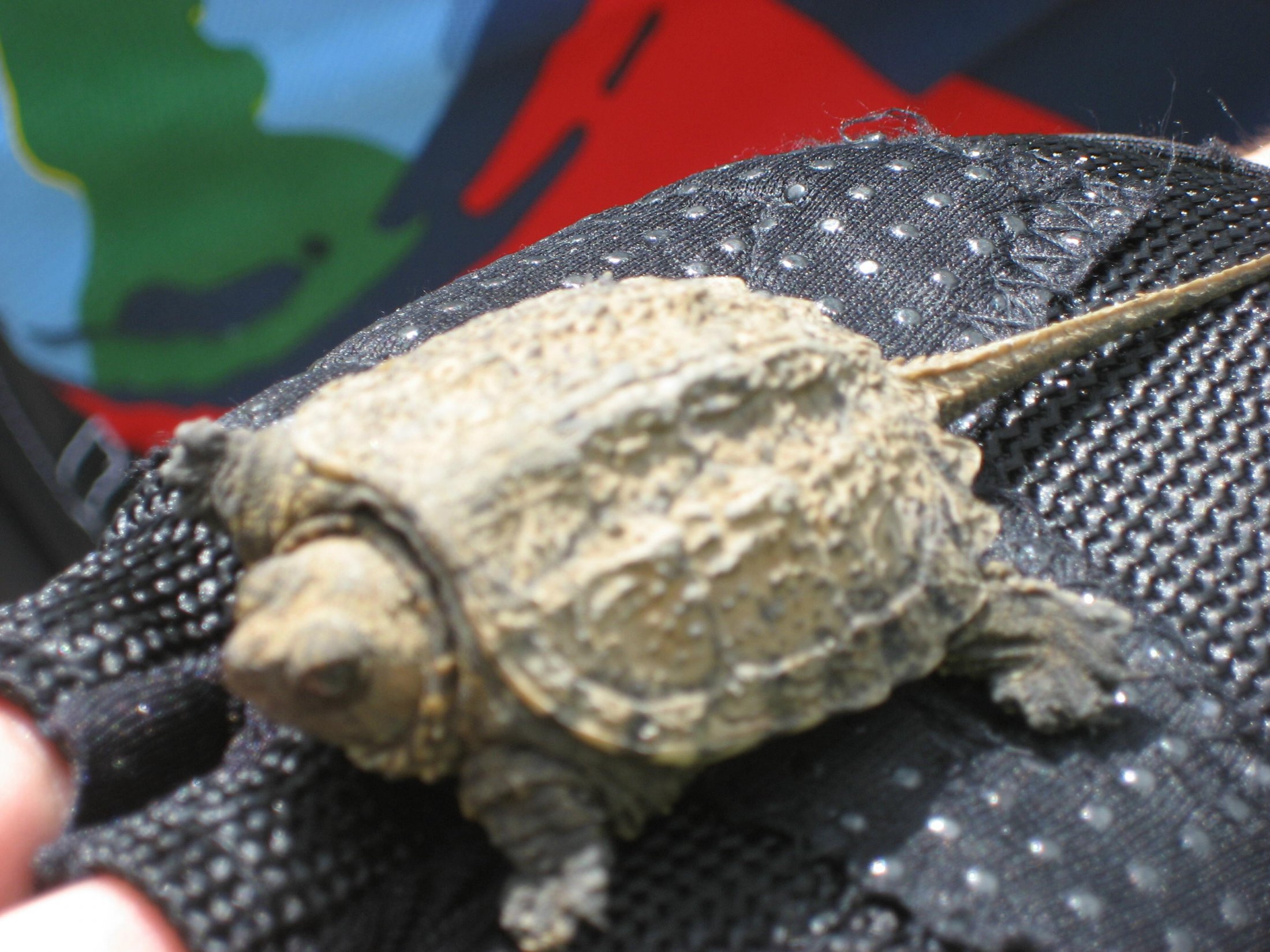 Diese kleine Schildkröte sitzt auf einer Hand bzw. auf einem Handschuh.